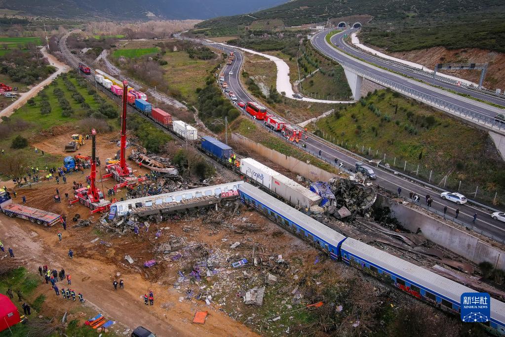 這是3月1日在希臘中部城市拉里薩市附近拍攝的火車(chē)相撞事故現場(chǎng)(無(wú)人機照片)。