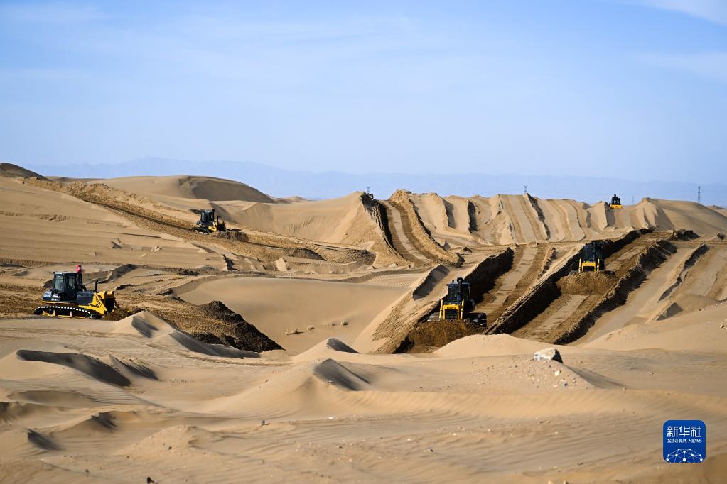 3月3日在內蒙古鄂爾多斯市達拉特旗拍攝的建設中的庫布其沙漠鄂爾多斯中北部新能源基地項目。