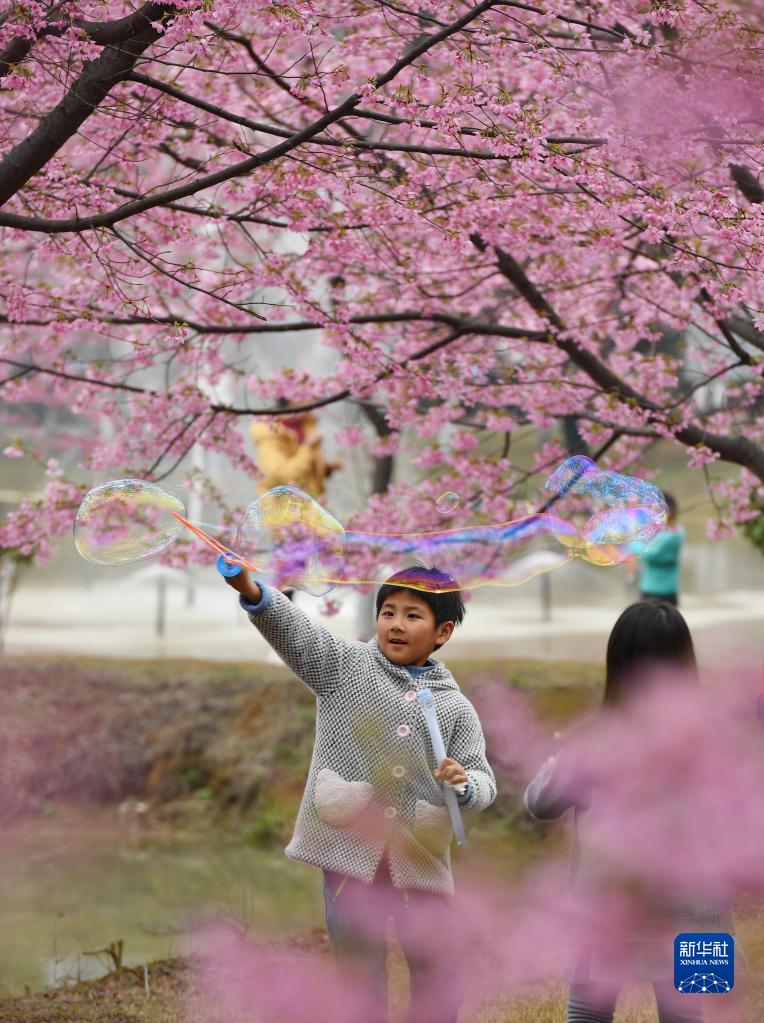 3月4日,小朋友在常寧市羅橋鎮櫻花園內玩耍。