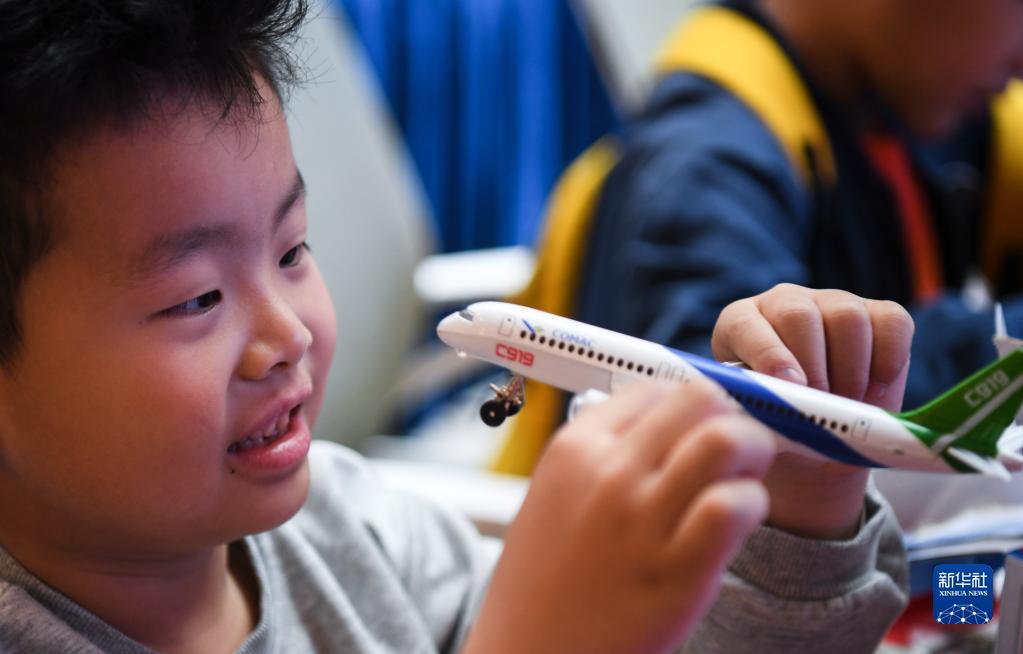 3月4日,在廣州黃埔區的航空輪胎大科學(xué)中心展覽館,參加研學(xué)活動(dòng)的小朋友觀(guān)看國產(chǎn)飛機模型。
