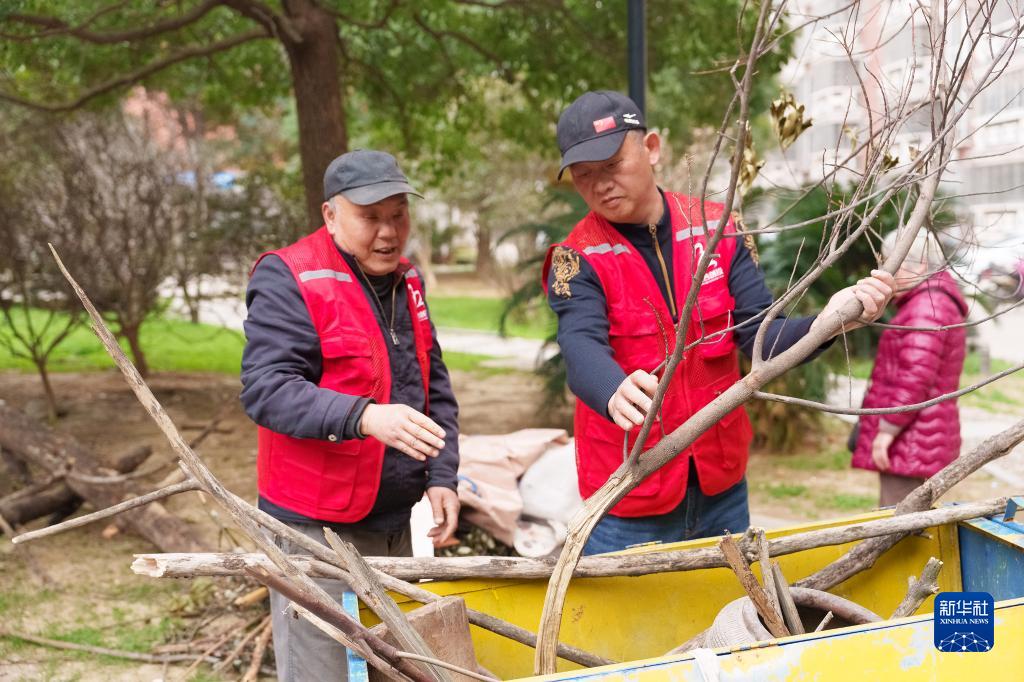 “小桔燈”服務(wù)社的志愿者在南昌市青云譜區徐家坊街道錦聯(lián)社區進(jìn)行清理枯枝斷木的志愿服務(wù)(3月3日攝)。