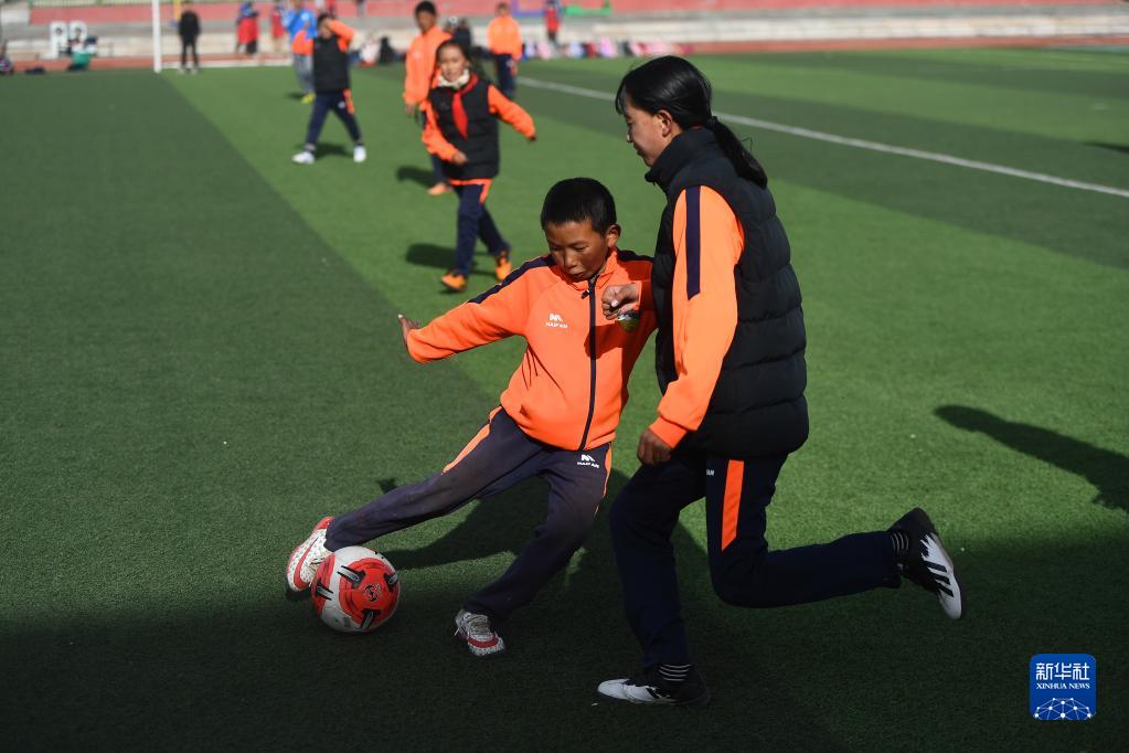 3月1日,在玉樹(shù)州曲麻萊縣第一完全小學(xué),曲麻萊青訓隊球員多杰然?。ㄇ白螅┰谟柧氄n上過(guò)人。