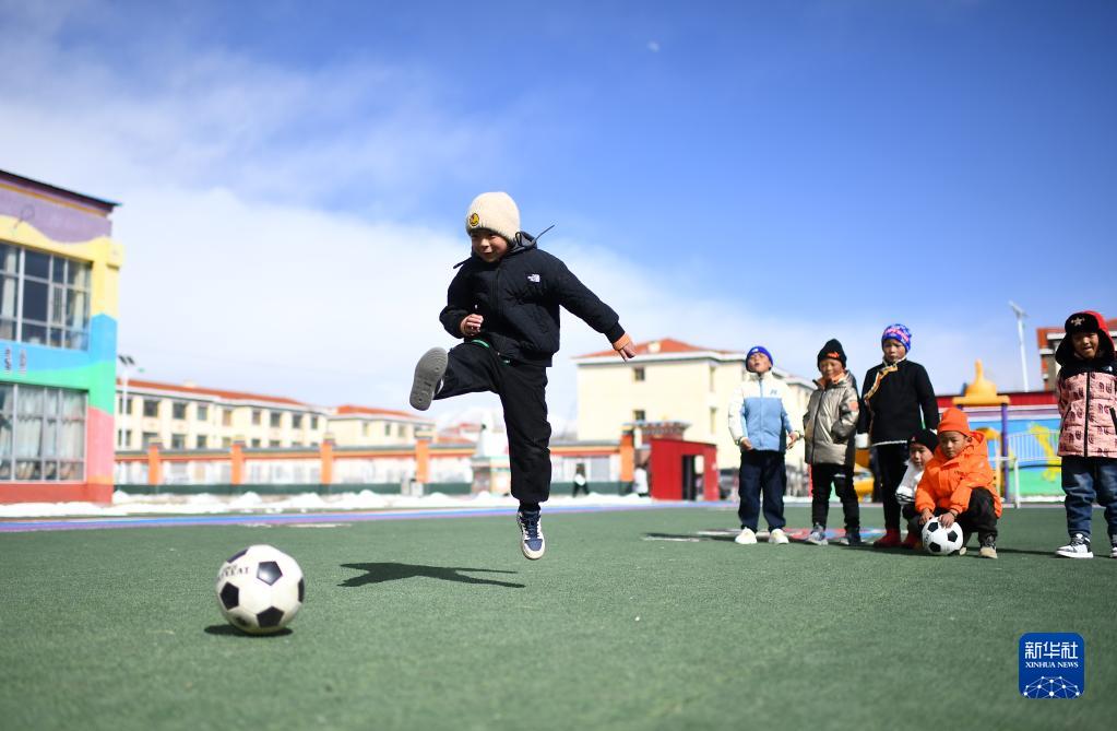 3月1日,在玉樹(shù)州治多縣,城南幼兒園小朋友旦增然桑(左一)在練習射門(mén)。