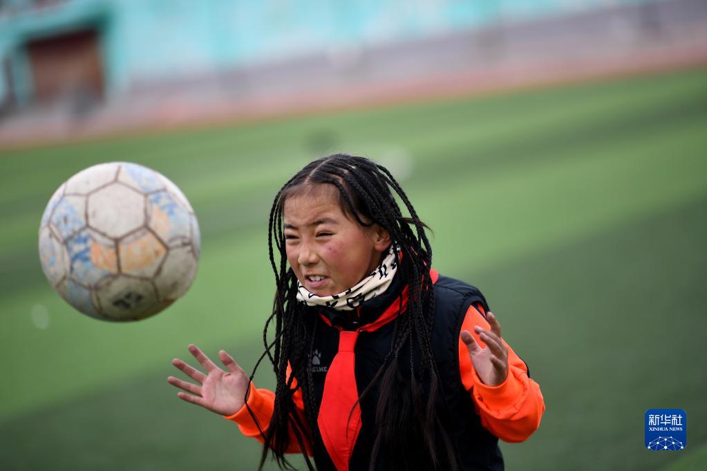 3月1日,在玉樹(shù)州曲麻萊縣第一完全小學(xué),曲麻萊青訓隊球員羅松卡卓在訓練課上練習頭球。