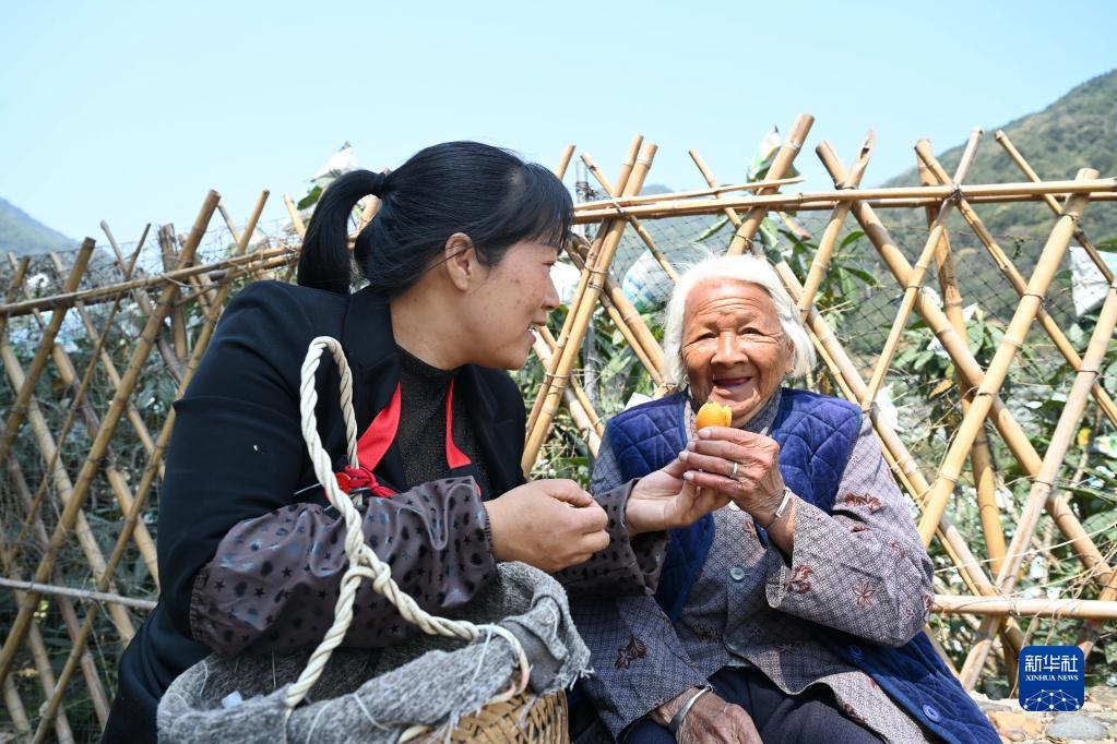 3月3日,吳素華(左)請村里的老人品嘗剛摘下的新鮮枇杷。