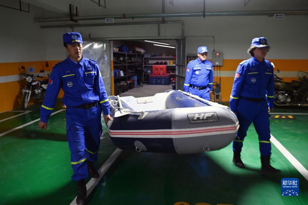 3月4日,劉富強(左一)在嘉峪關(guān)藍天救援隊裝備庫搬運救援裝備沖鋒舟。