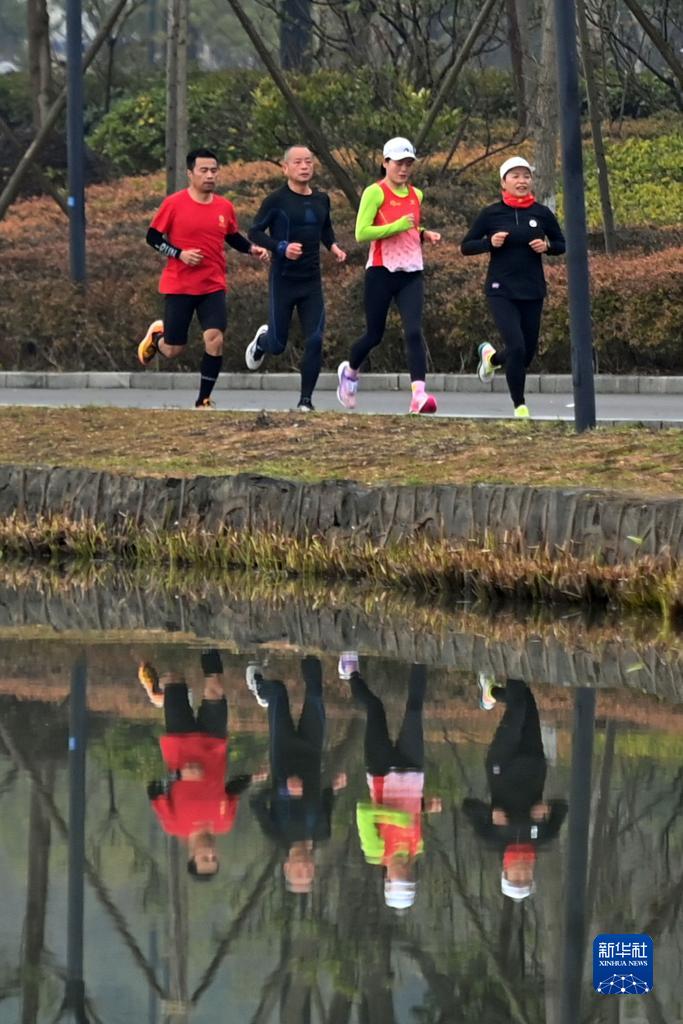3月1日,跑步愛(ài)好者在浙江省寧波市奉化區仁湖公園晨跑。