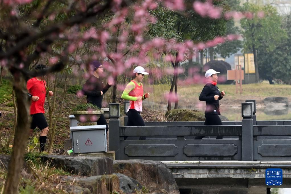 3月1日,跑步愛(ài)好者在浙江省寧波市奉化區仁湖公園晨跑。