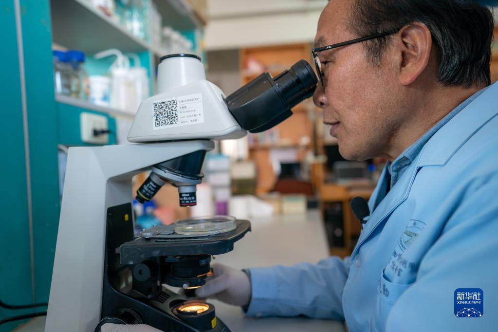 張克勤在實(shí)驗室用顯微鏡觀(guān)察線(xiàn)蟲(chóng)(2月6日攝)。 新華社記者 江文耀 攝