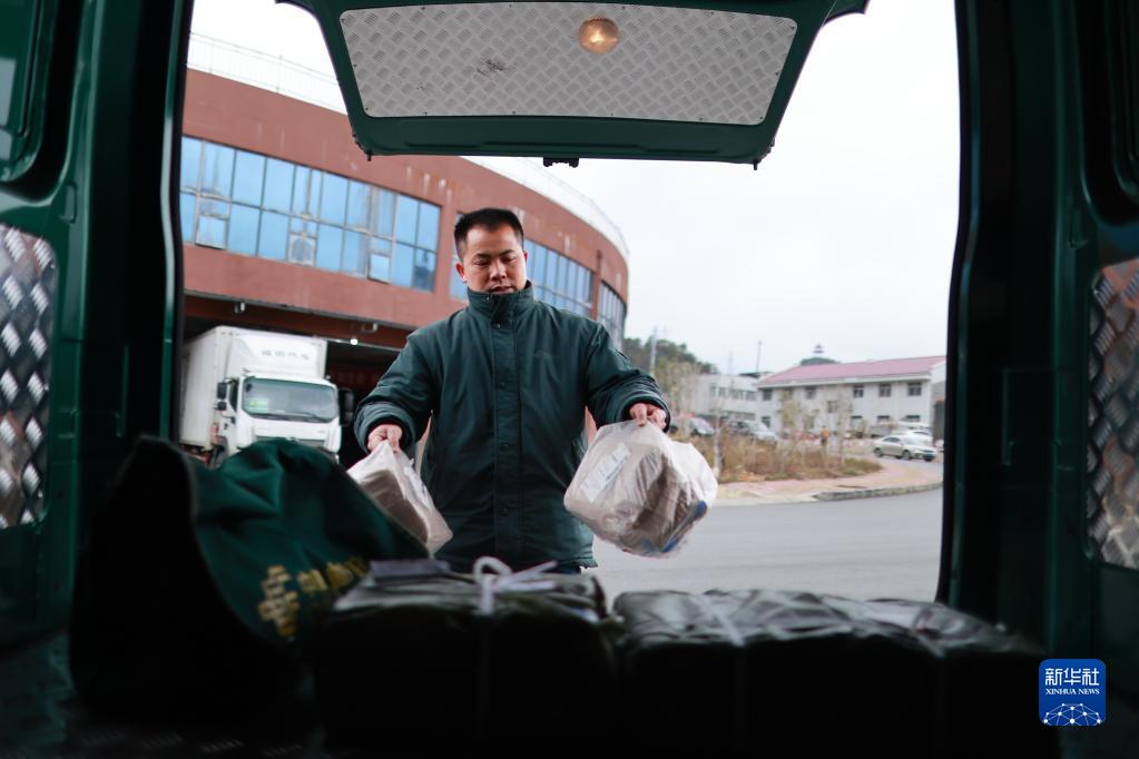 在貴州省龍里縣草原路郵政郵件處理中心外,莫富元將當天需要投遞的物品拿上小貨車(chē)(2月14日攝)。