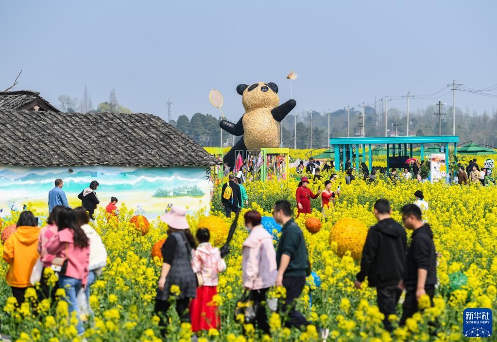 近日,位于四川成都崇州市的數萬(wàn)畝油菜花競相綻放,吸引游客前來(lái)踏春觀(guān)光。