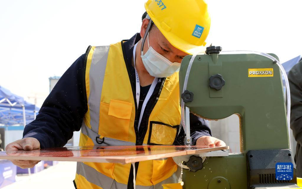 3月6日,參賽選手在進(jìn)行裝飾裝修工(鑲貼工)項目比賽。