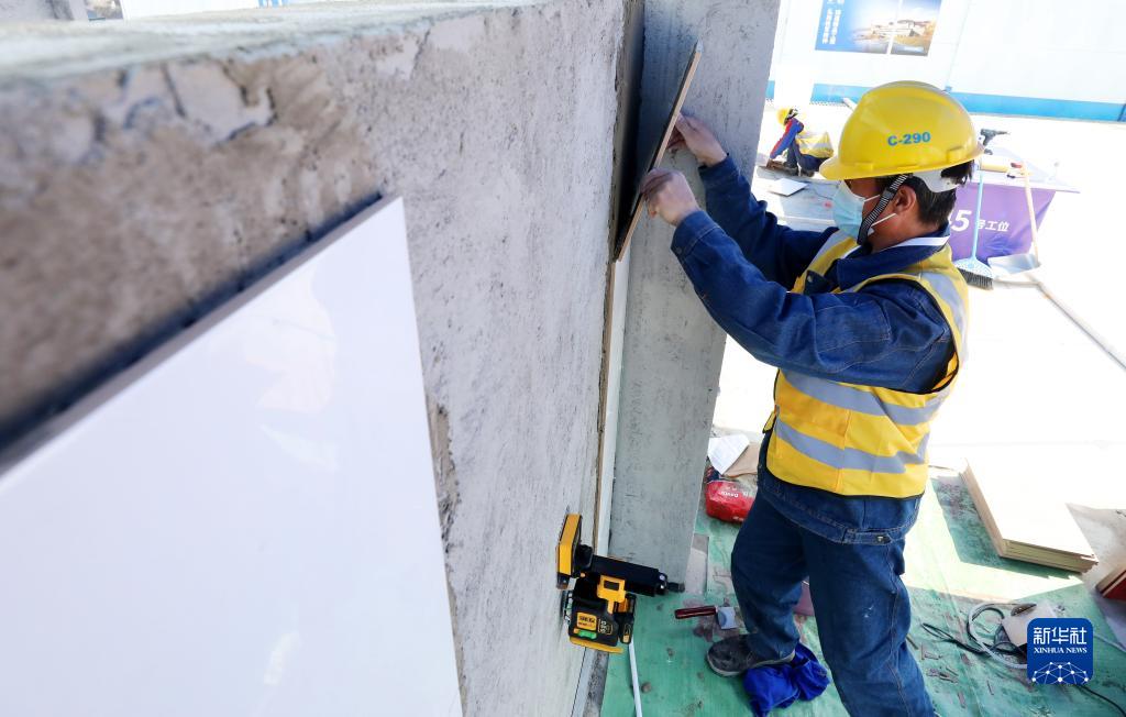 3月6日,參賽選手在進(jìn)行裝飾裝修工(鑲貼工)項目比賽。