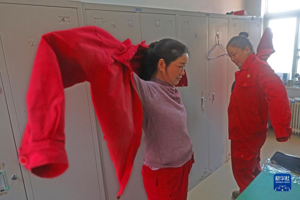 2月27日,余容(左)和李文靜在車(chē)間更衣室換上工服準備工作。