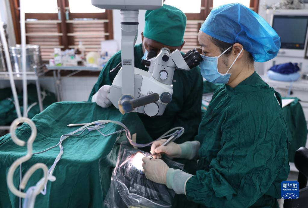 2月23日,在坦桑尼亞桑給巴爾島納茲莫加醫院,董莉莉為穆欣做白內障超聲乳化摘除手術(shù)。