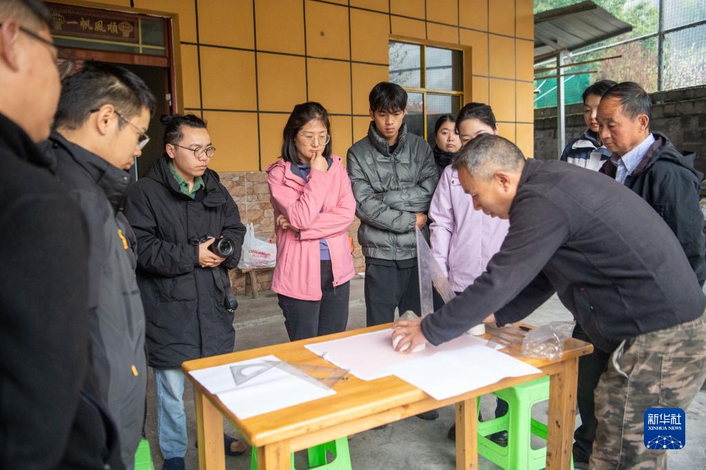 2023年3月6日,在位于重慶市武隆區的白馬航電樞紐文物保護項目前方考古隊駐地,燕妮(中)與工作人員在對“重慶市第三期田野考古培訓班” 學(xué)員進(jìn)行考古技能培訓。