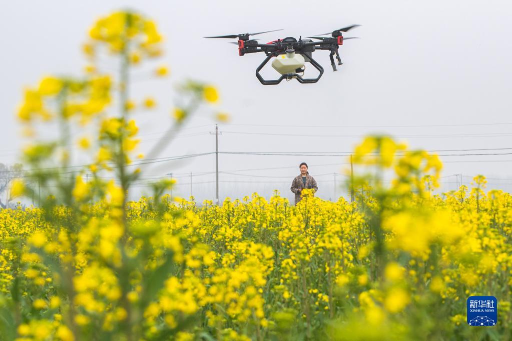 3月1日,在湖北省天門(mén)市黃潭鎮一處油菜田,女飛手陳碧容利用植保無(wú)人機進(jìn)行噴藥作業(yè)。