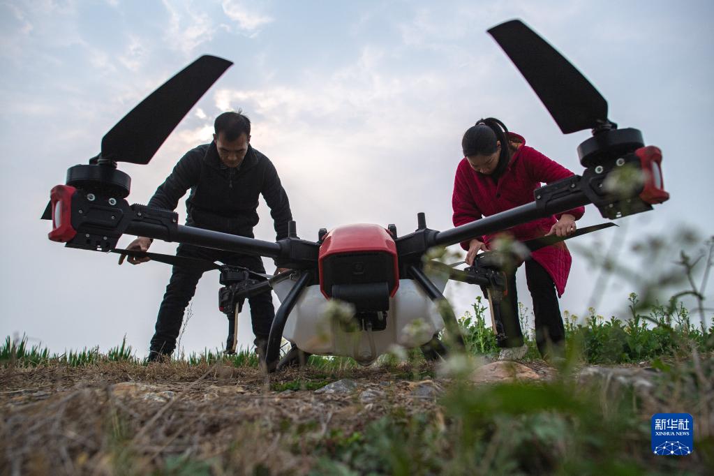3月1日,吳玲(右)與丈夫在進(jìn)行植保無(wú)人機飛防作業(yè)前的準備工作。