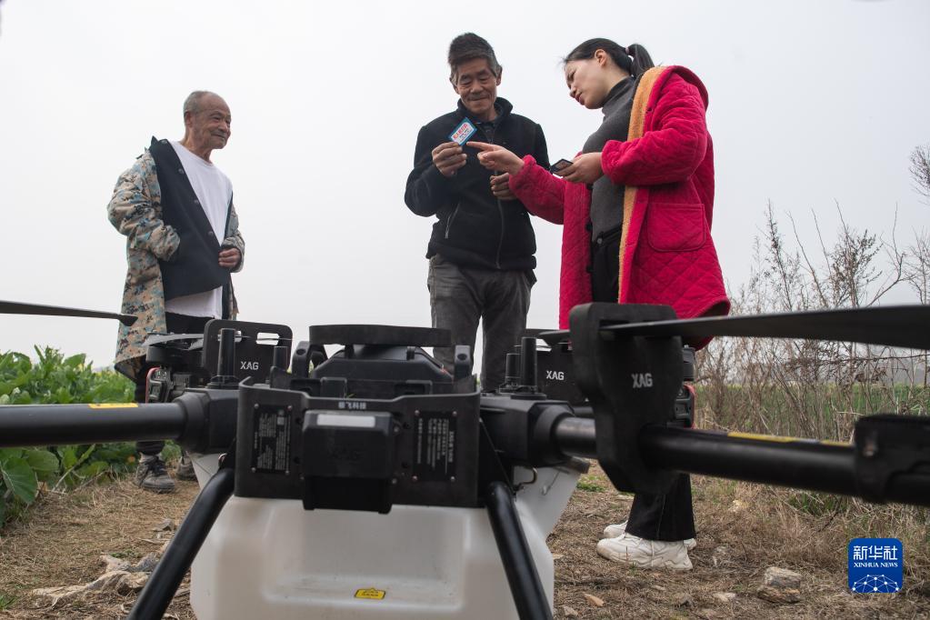3月1日,女飛手吳玲(右一)向農戶(hù)宣傳推廣無(wú)人機植保技術(shù)。