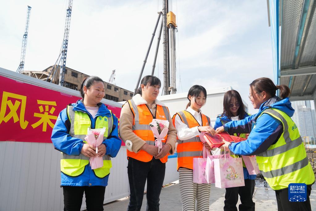 3月7日,中建三局上海嗶哩嗶哩新世代產(chǎn)業(yè)園項目部工地的女工領(lǐng)取節日慰問(wèn)品。