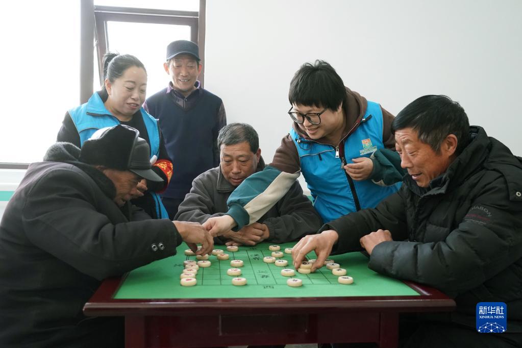 3月7日,在北京市峪口鎮西樊各莊村養老驛站,王巖峰(右二)與同事劉淑伶(左二)一起組織村中老人下象棋。