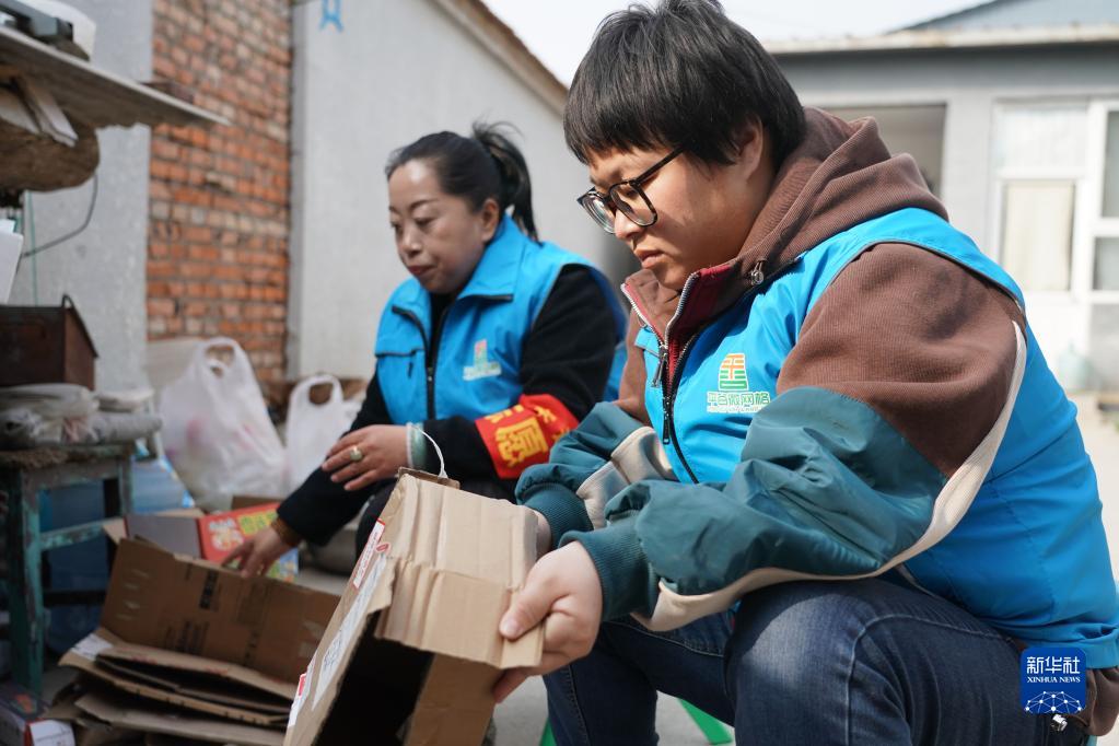 3月7日,在北京市峪口鎮西樊各莊村,王巖峰(右)與同事劉淑伶幫助村里一家老人整理院子。