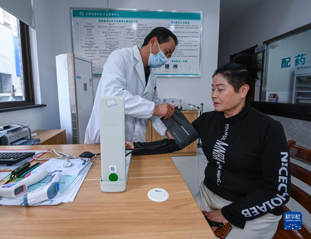 3月7日,在嘉興市南湖區南江社區衛生室內,醫生在給老人測量血壓。