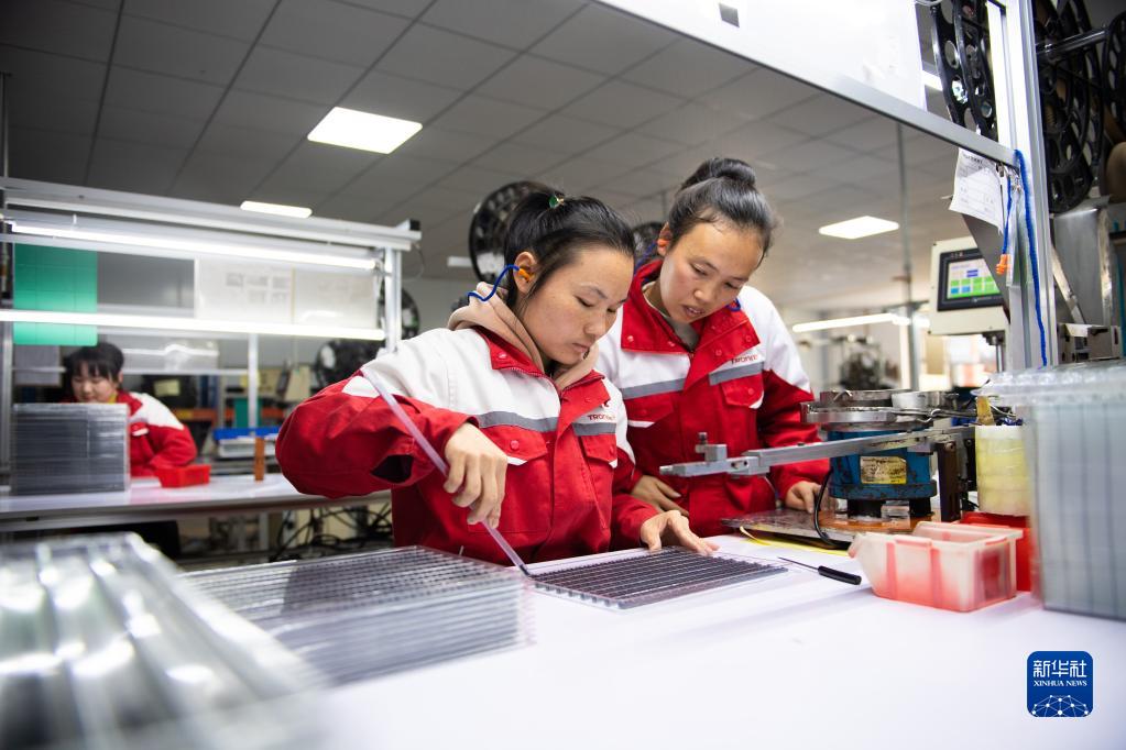 3月7日,在汨羅市神鼎山鎮豐倉村的“巾幗車(chē)間”,新入職的工作人員(右)在學(xué)習生產(chǎn)數據線(xiàn)。