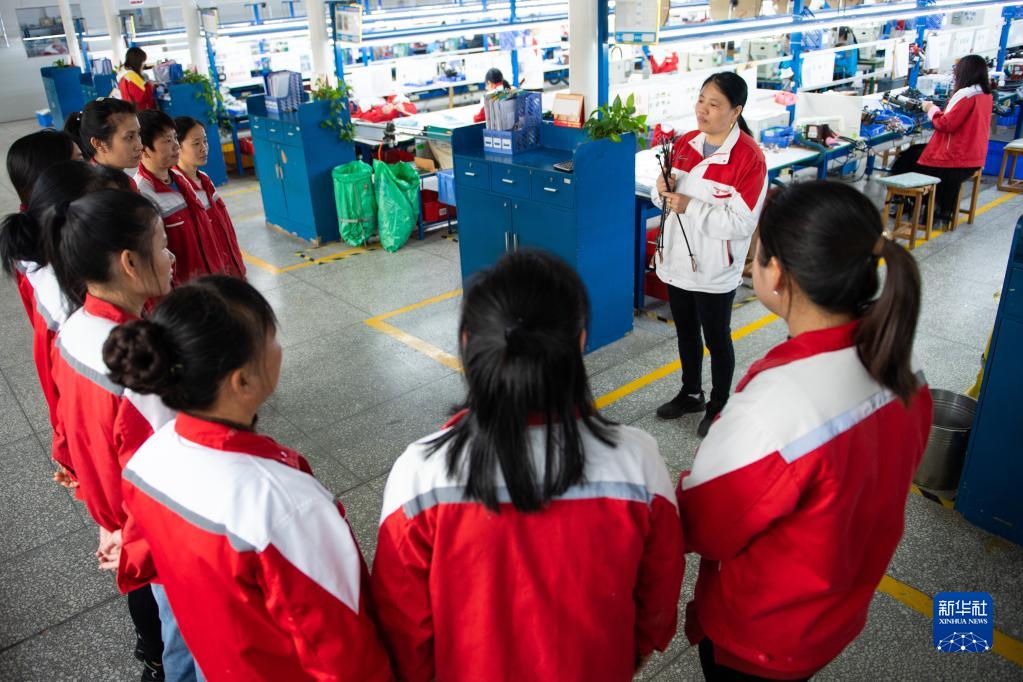 3月7日,在汨羅市神鼎山鎮豐倉村的“巾幗車(chē)間”,工作人員在做新產(chǎn)品生產(chǎn)培訓。