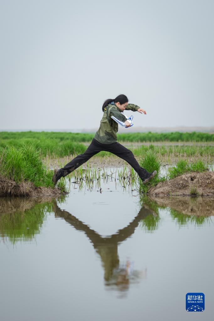 3月7日,譚文卓在進(jìn)行鳥(niǎo)類(lèi)監測工作途中跨過(guò)一個(gè)水溝。