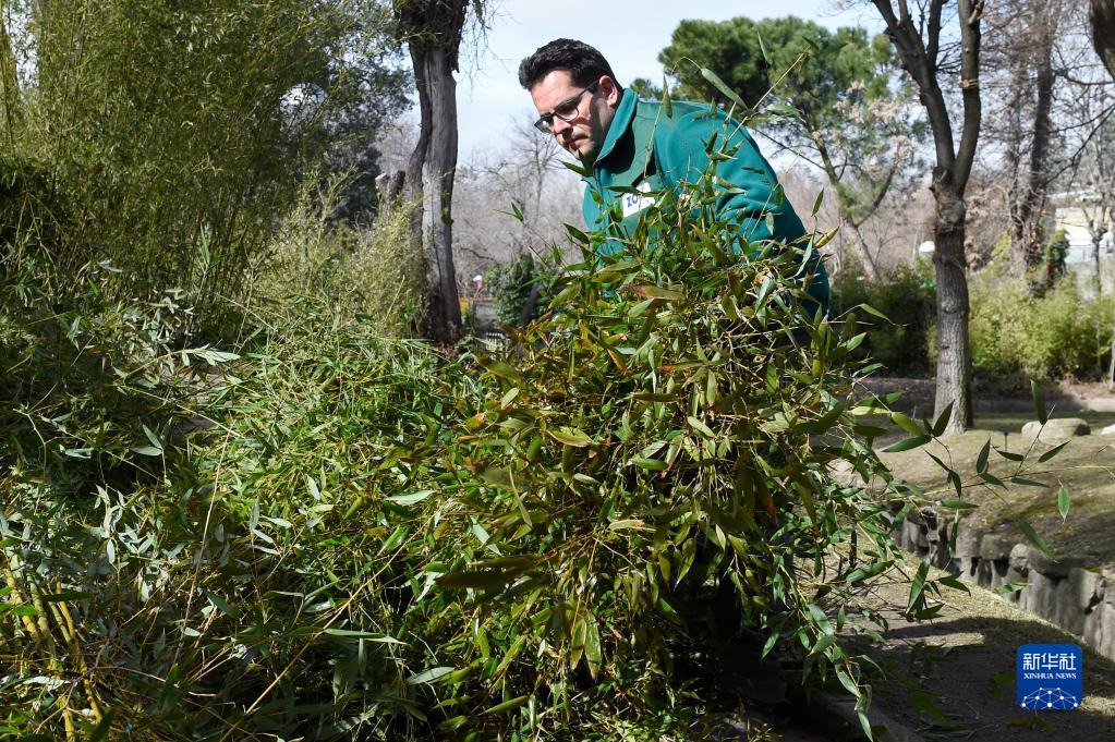 3月7日,大熊貓飼養員亞歷杭德羅·卡布雷拉在西班牙馬德里動(dòng)物園工作。