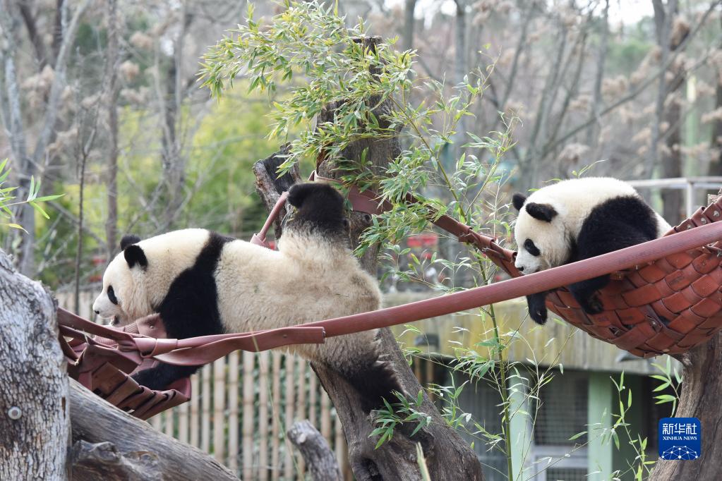 3月7日,大熊貓友友和久久在西班牙馬德里動(dòng)物園內玩耍。