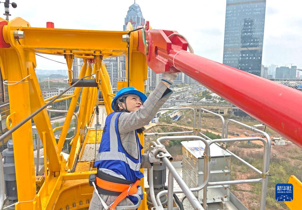 3月7日,在廣西南寧市良慶區五象大道中建三局一公司南寧中銀金融中心項目建設工地,覃桂英在檢查塔吊。