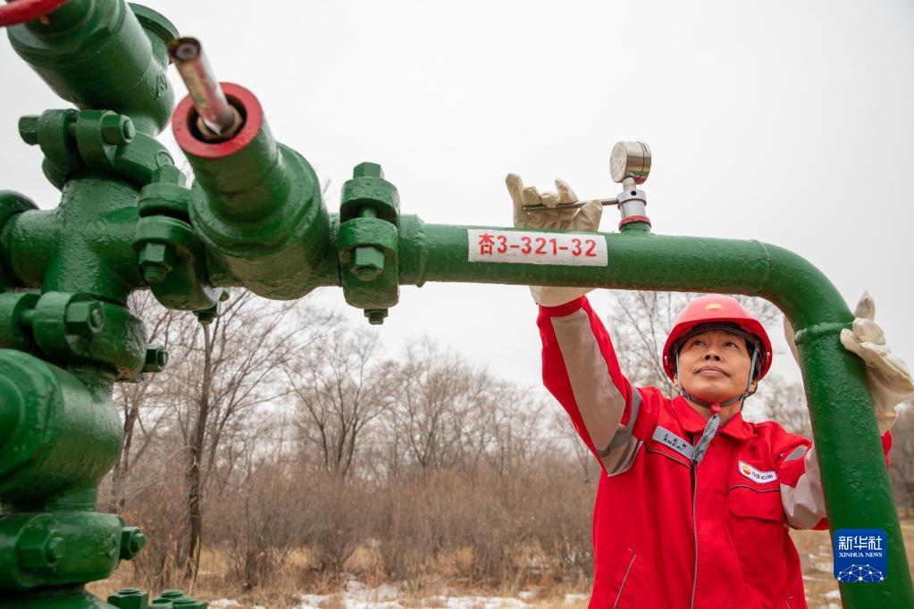 3月7日,在大慶油田第四采油廠(chǎng)第一作業(yè)區,北六隊采油工王莉娜在測取水井油壓。