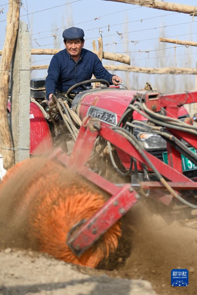 3月8日,在吐魯番市高昌區葡萄鎮,農民操作開(kāi)墩機在葡萄地里作業(yè)。