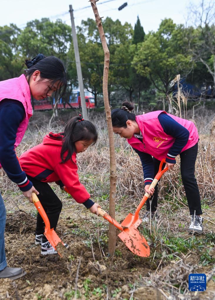 3月8日,在長(cháng)興縣李家巷鎮青草塢村的荒地上,孩子們在老師和志愿者的帶領(lǐng)下種下烏桕樹(shù)苗。