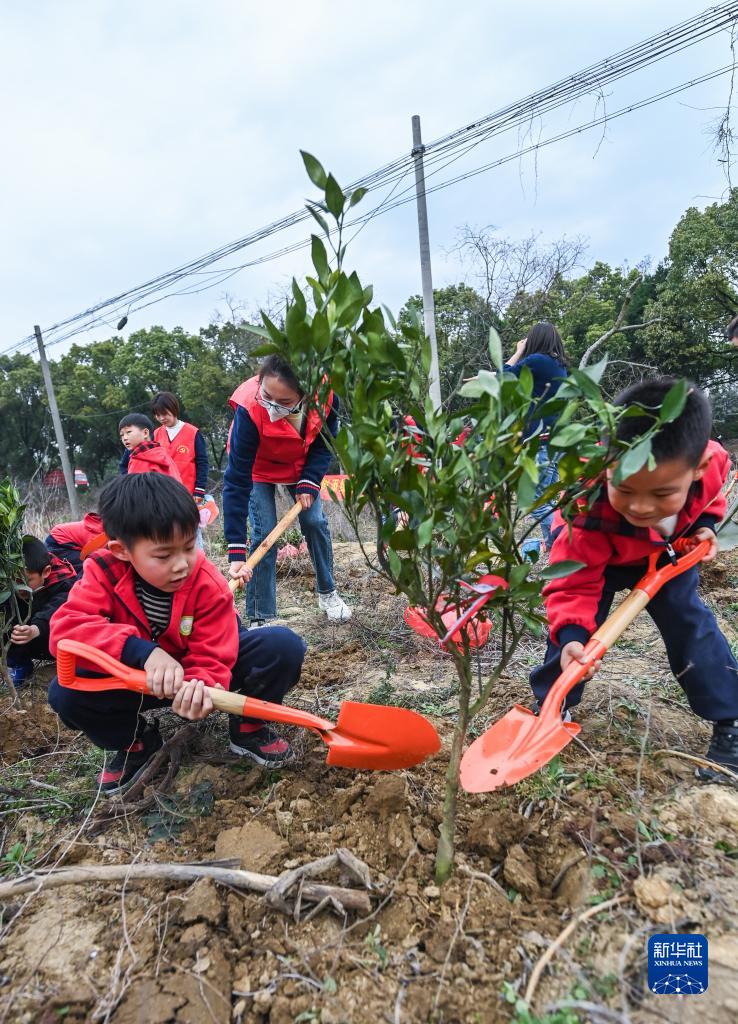 3月8日,在長(cháng)興縣李家巷鎮青草塢村的荒地上,孩子們在老師和志愿者的帶領(lǐng)下種下橘子樹(shù)苗。