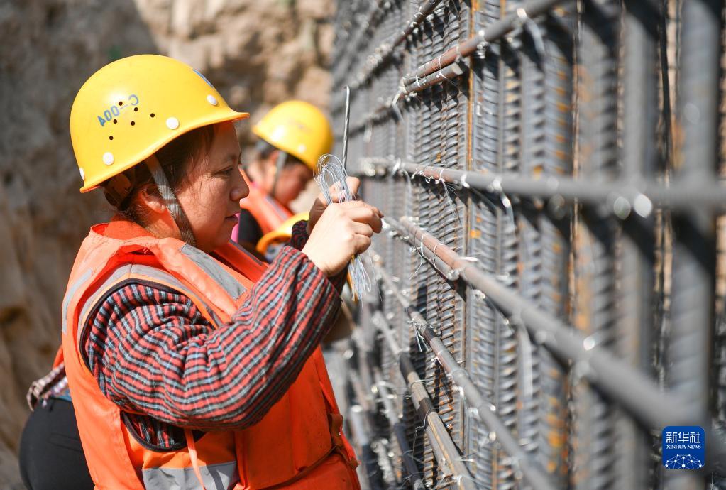 3月8日,在位于陜西省西安市國際港務(wù)區的水流路跨灞河大橋項目施工現場(chǎng),中建三局西北公司鋼筋工楊瓊華在施工現場(chǎng)工作。