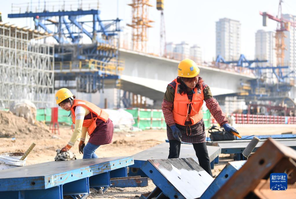 3月8日,在位于陜西省西安市國際港務(wù)區的水流路跨灞河大橋項目施工現場(chǎng),中建三局西北公司模板工趙菊華(左)、汪仕英在施工現場(chǎng)工作。