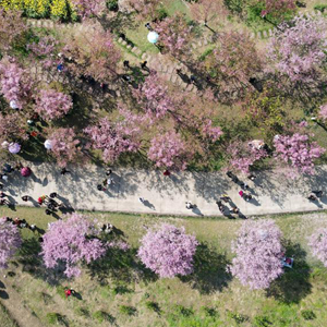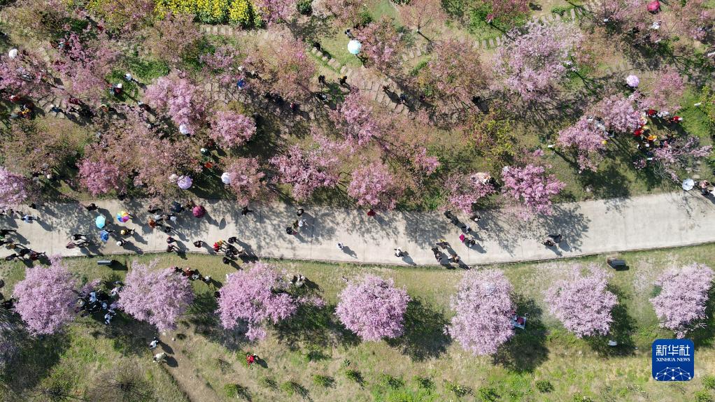 這是3月8日拍攝的都江堰市青城山鎮“問(wèn)花村”櫻花大道一角(無(wú)人機照片)。