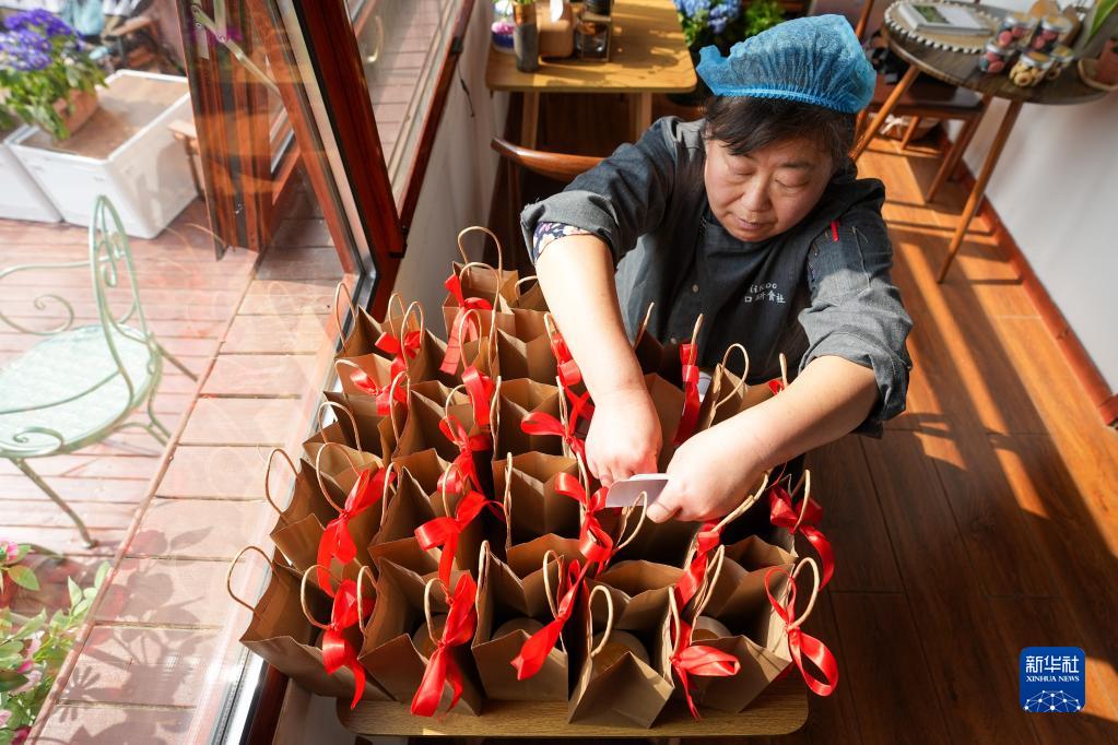 在北京市密云區金叵羅村的西口研食社內,“三嫂子”楊紅艷在打包客人預定的小米酥伴手禮(2023年3月7日攝)。