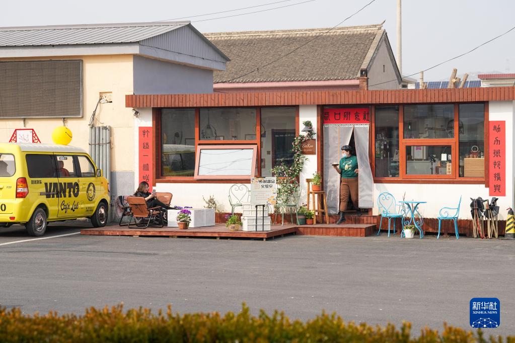 在北京市密云區金叵羅村的西口研食社外,劉甜恬(右)為來(lái)店里的客人上甜點(diǎn)(2023年3月7日攝)。