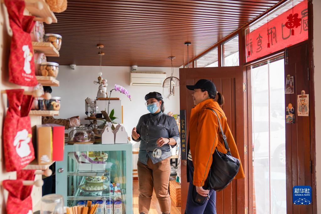 在北京市密云區金叵羅村的西口研食社內,劉甜恬(中)為客人介紹店內的特色產(chǎn)品(2023年3月7日攝)。
