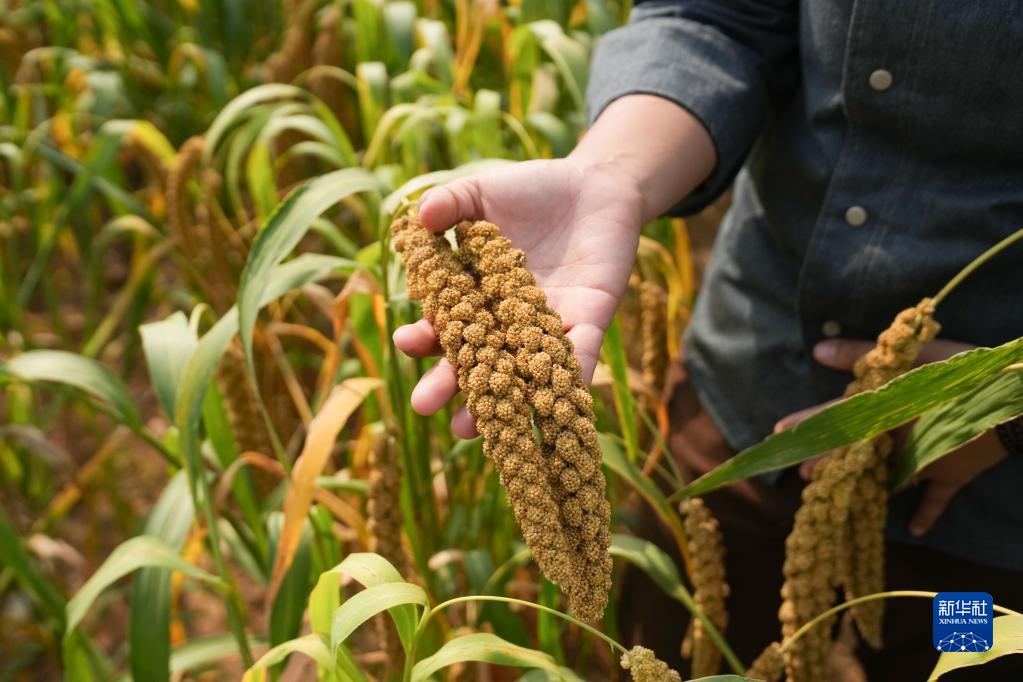 在北京市密云區金叵羅村的谷子地里,劉甜恬展示飽滿(mǎn)的谷穗(2022年9月28日攝)。