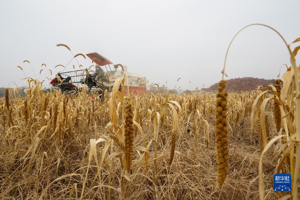 在北京市密云區金叵羅村的谷子地里,農民駕駛農機進(jìn)行收割(2022年10月20日攝)。