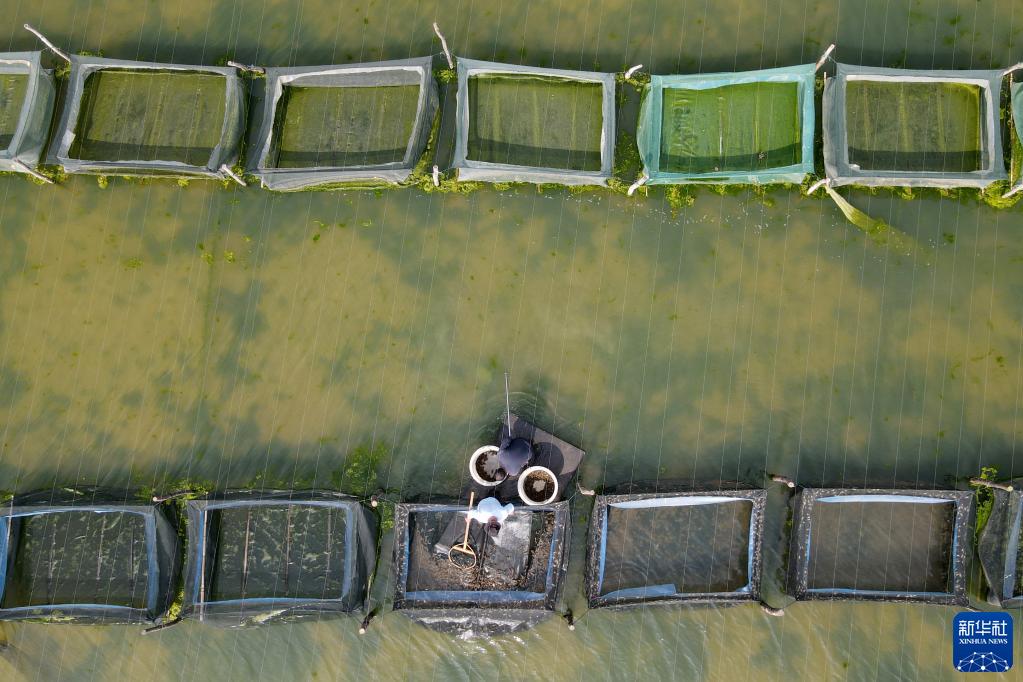 3月9日,在安徽省蚌埠市五河縣申集鎮,蟹農從網(wǎng)箱中撈出培育好的蟹苗(無(wú)人機照片)。