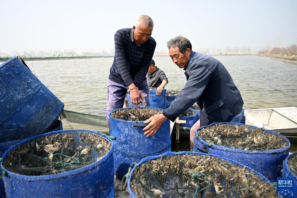3月9日,在安徽省蚌埠市五河縣小圩鎮,蟹農準備投放蟹苗。