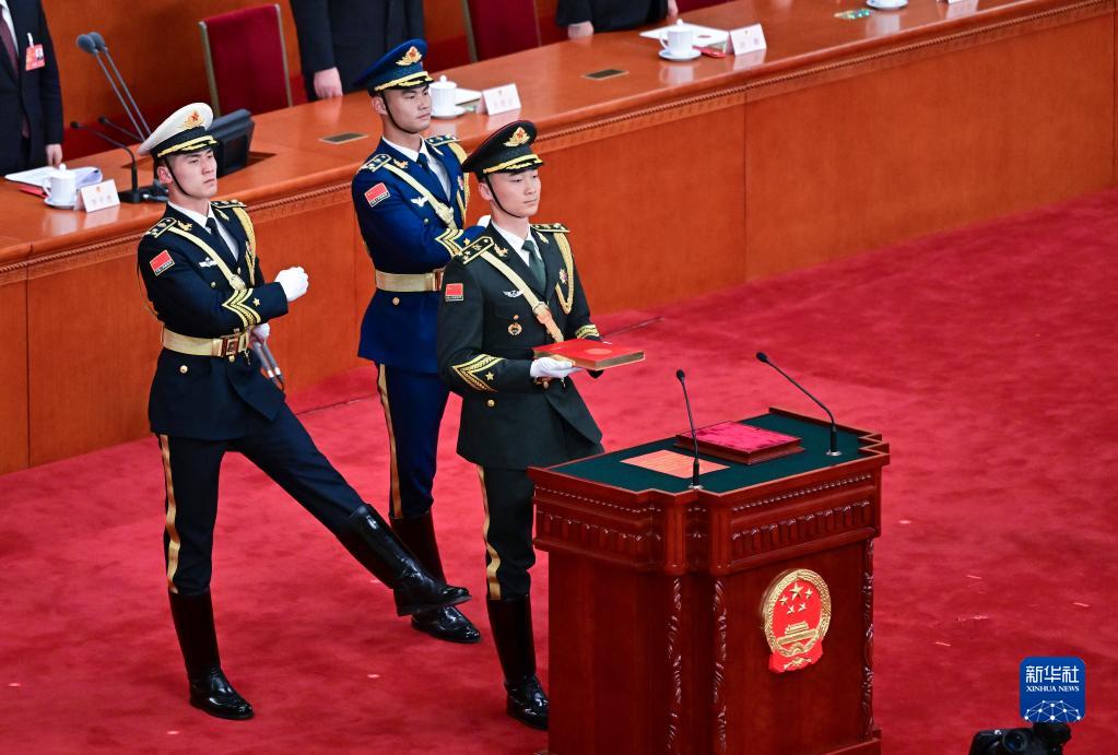 3月10日,中華人民共和國第十四屆全國人民代表大會(huì )第一次會(huì )議憲法宣誓儀式在北京人民大會(huì )堂舉行。主席臺上,3名禮兵邁著(zhù)正步護送《中華人民共和國憲法》入場(chǎng)。