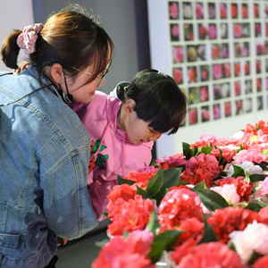 3月10日,在金華市婺城區竹馬鄉的茶花展上,家長(cháng)帶著(zhù)小朋友觀(guān)賞茶花。
