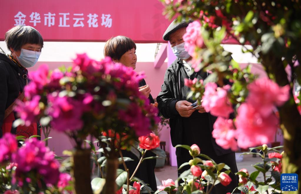 3月10日,人們在金華市人民廣場(chǎng)的茶花展上參觀(guān)選購。